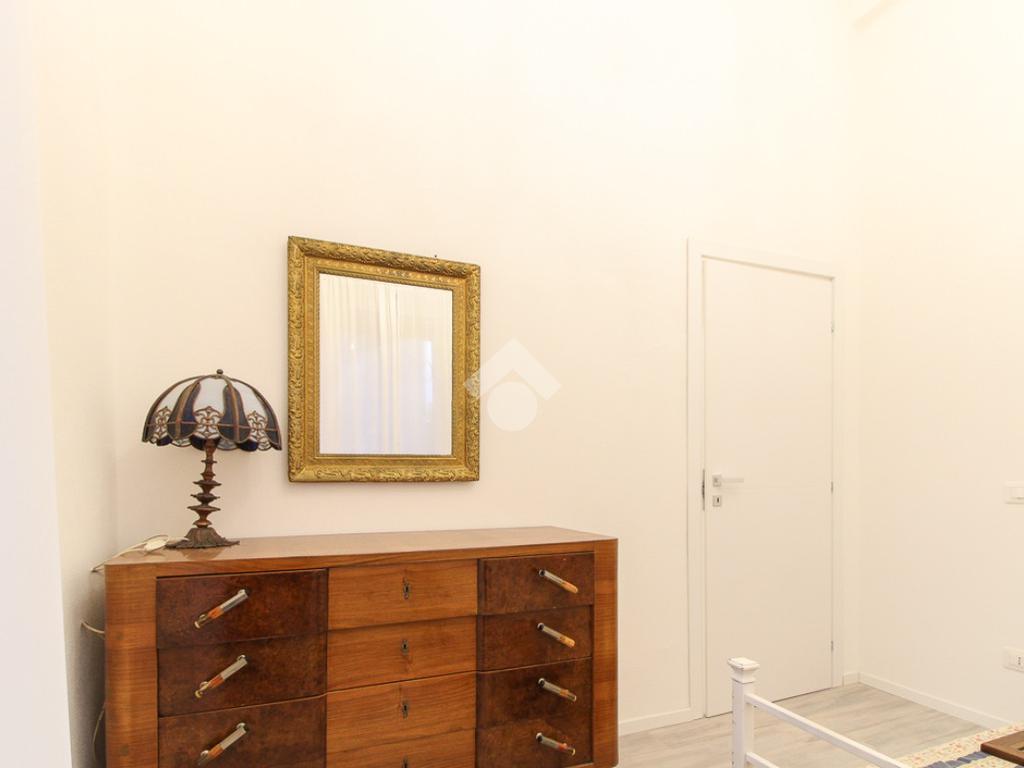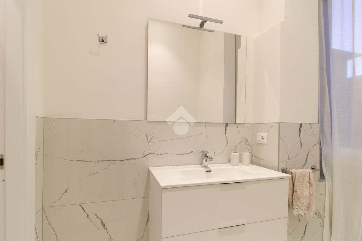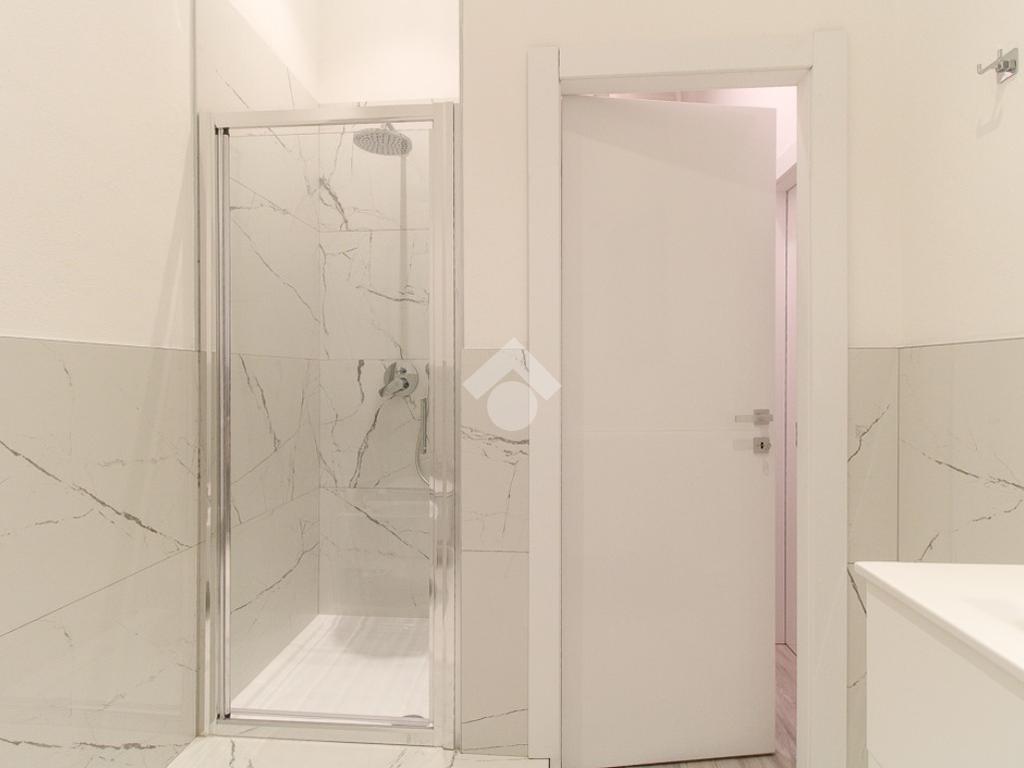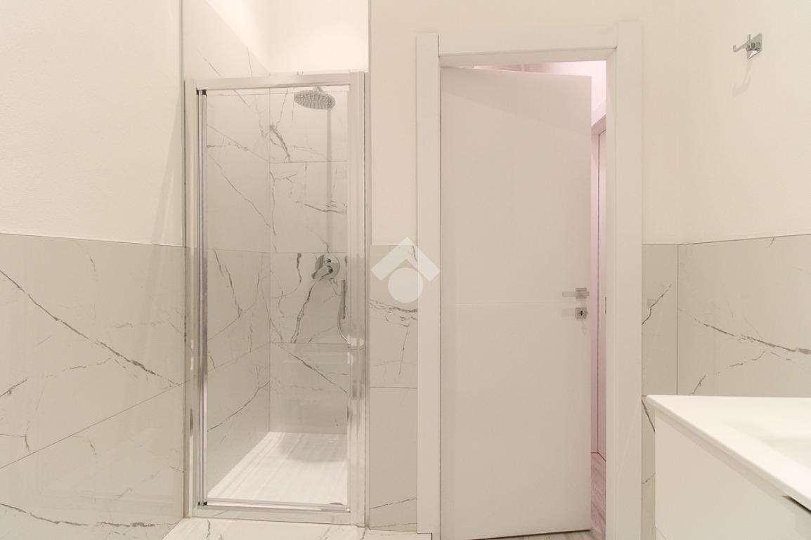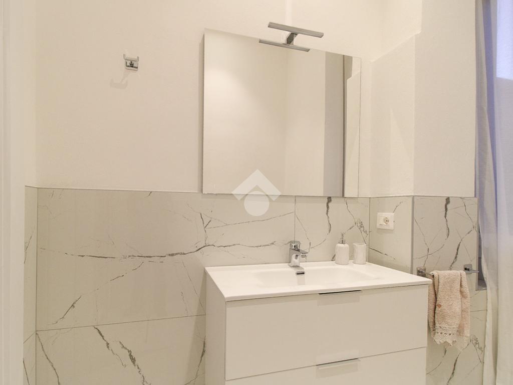 Il bagno, anch'esso recentemente ristrutturato, è dotato di tutti i comfort moderni, tra cui una spaziosa doccia e un elegante lavabo sospeso.