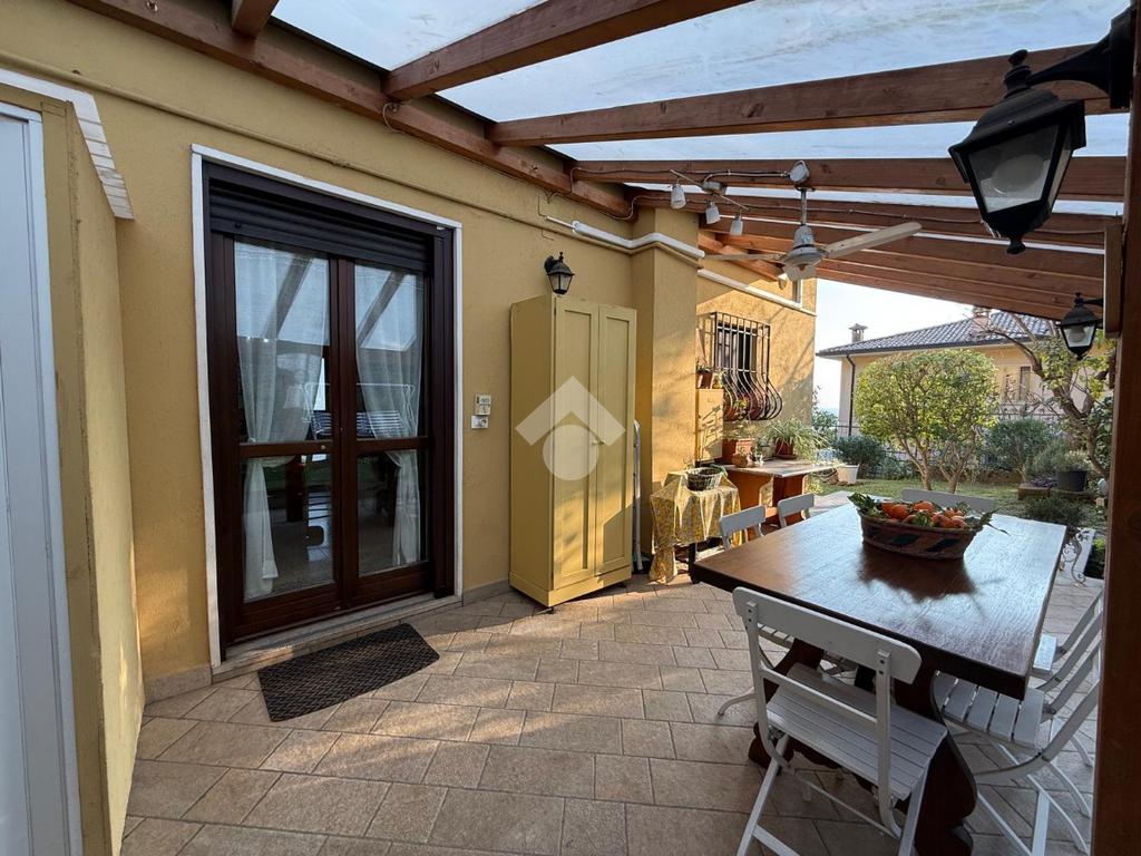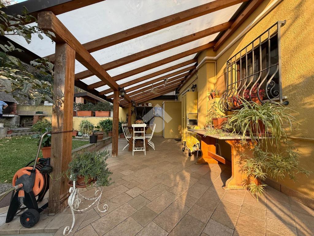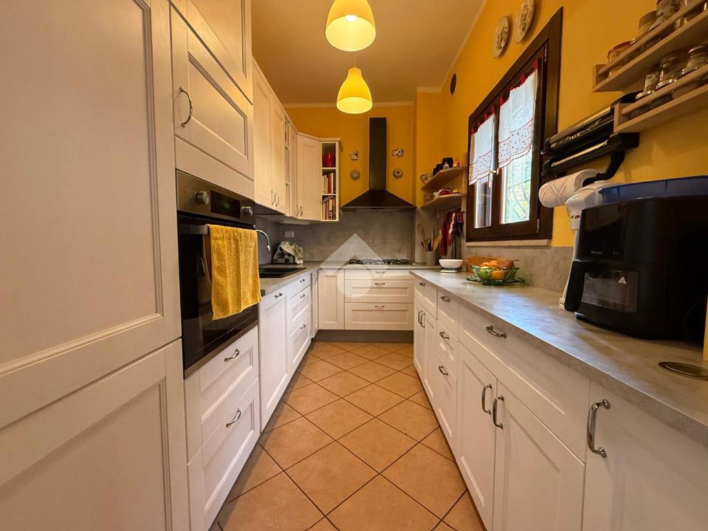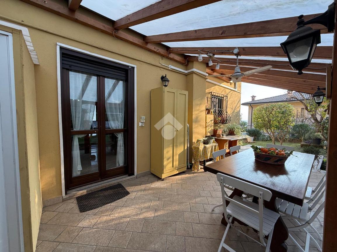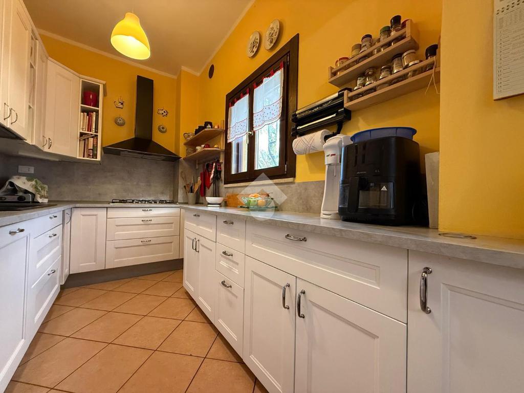 L’ingresso conduce alla luminosa zona giorno e alla spaziosa cucina separata e abitabile, dalla quale, tramite una porta finestra, si accede a una terrazza coperta con piacevole vista sul giardino. La zona notte è composta da una camera matrimoniale, due camere doppie e un bagno finestrato, ristrutturato circa dodici anni fa e completo di box doccia.